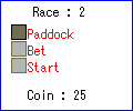 ・上下のキーを操作し、選択キーでパドック(Paddock)、馬券購入(Bet)、レース開始(Start)を選んで下さい。